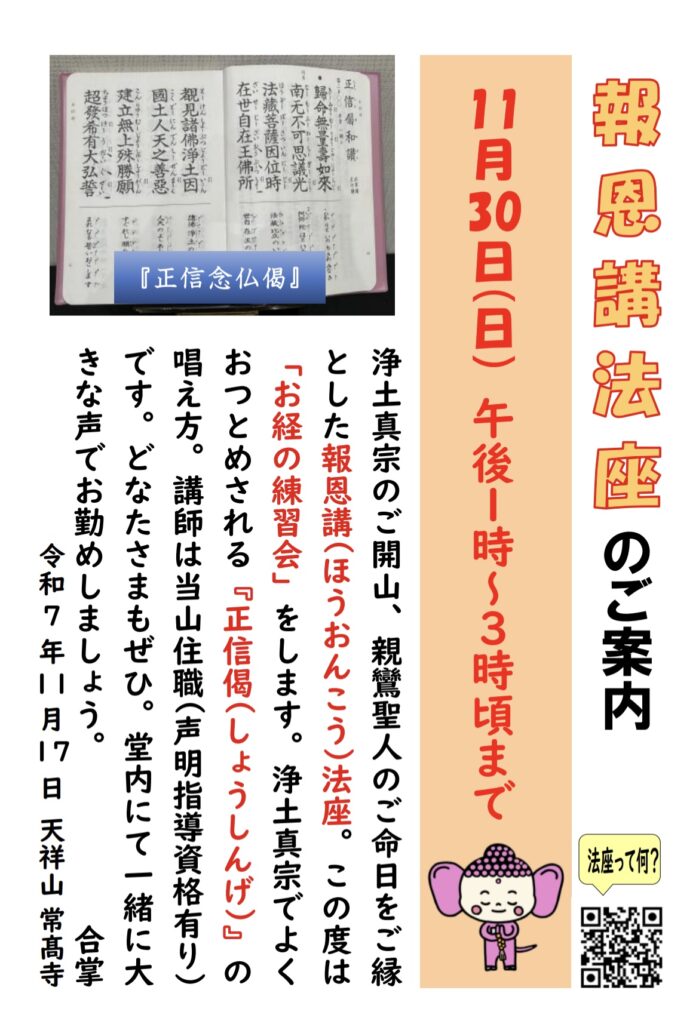 浄土真宗のご開山、親鸞聖人のご命日をご縁とした報恩講(ほうおんこう)法座。